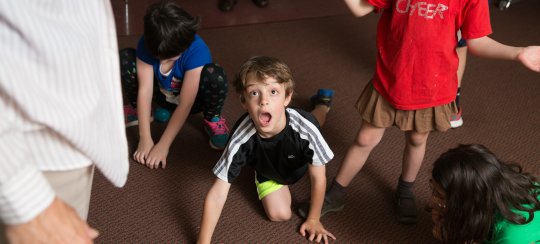 "To close our theater lessons, we'll appreciate our work and each other with a unified clap. On three we'll all clap once and say, 'Huh!' 1-2-3 (clap) Huh!"